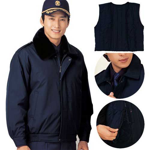 털에리, 어깨 견장 탈부착 가능, 조끼 라이나 스타일의 진곤색 경비점퍼입니다.