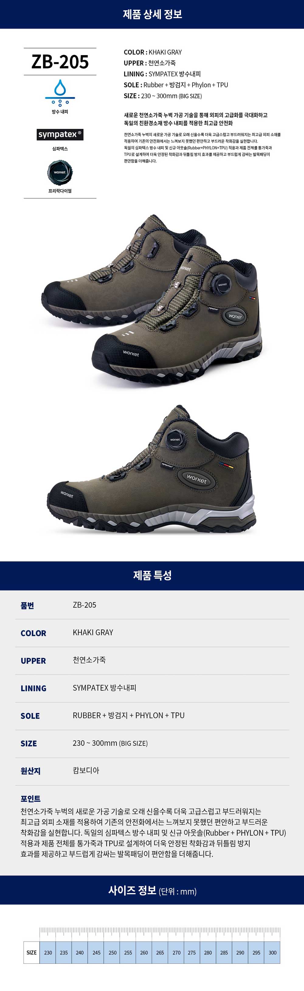 ZB-205 (6인치 천연 소가죽 안전화, 작업화, 카키)