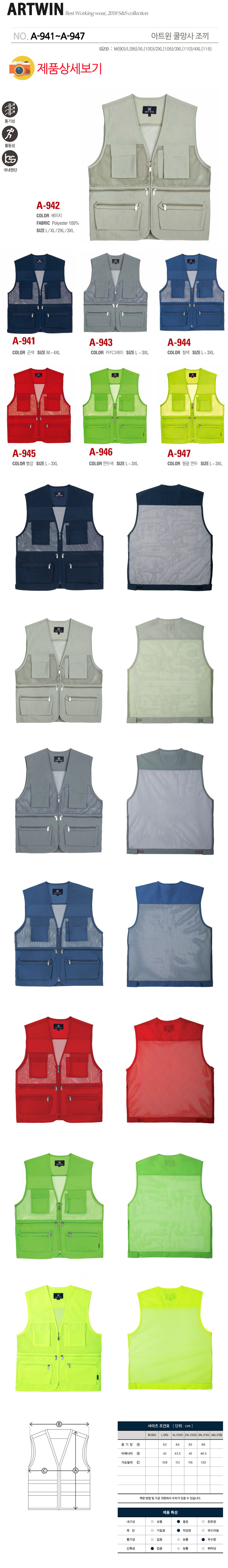 A-941~A947 (7색상, 아트윈 쿨망사조끼, A941만 M,4XL 가능)